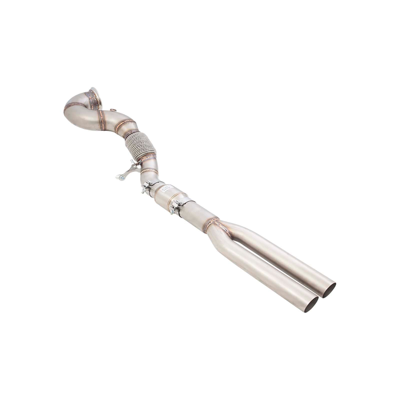 Introducing the Xforce Downpipe for the Audi 8V RS3 - the ultimate upgrade for performance enthusiasts. Designed to maximize exhaust flow, this downpipe replaces the restrictive factory component, unlocking the full potential of your engine. Crafted from high-quality stainless steel, the Xforce Downpipe is engineered for a precise fit and long-lasting durability. The mandrel-bent tubing and smooth transitions ensure maximum flow, resulting in improved throttle response, increased horsepower and torque, and a more aggressive exhaust note. The Xforce Downpipe is a direct replacement for the factory downpipe and deletes the secondary cats, making installation a straightforward process. No cutting or welding is required, and all necessary hardware is included. Take your Audi 8V RS3 to the next level with the Xforce Downpipe. Experience the thrill of driving a high-performance machine, with the added satisfaction of knowing you have the best upgrade on the market. Order yours today and feel the difference.